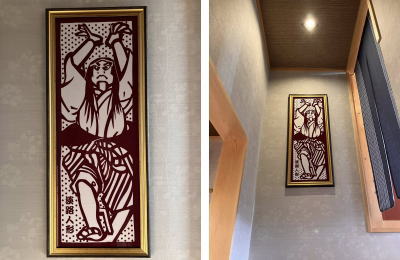 先日、淡路の人形浄瑠璃劇場で買った手ぬぐいを階段の踊り場に飾りました。 手ぬぐいはこの赤茶色と紺色があったのですが、ヨメ共々赤茶色だと意見が合って買いました(;^ω^) 畳の間はベンガラ色だし、左の手洗いのタイルもベンガラ系、右の暖簾は紺色なので、ここは赤茶色だとなったワケです。 額にしても簡易的なのは額縁が細くて今一つなので、庵に飾ることもあって、今回は少し奮発して金色の入った見え掛かりの広い額縁にしてみました。 予想通り、バッチリ決まったと思ってます(≧▽≦) |