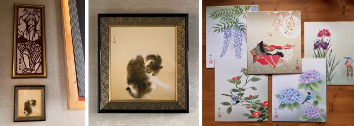 まだ〆るには早いですけど(笑) さて、先月の旅行で買った手拭ですけど、階段の踊り場の上部なのでどうしてもアイポイントが足元に行ってしまうので来客の目に入らない(;^_^A って事でその下に何か別の額でも掛ければいいかな?と思って色紙額を買ってみました。 色紙は結構リーズナブルなので四季に合わせて換えればと、6枚選びました。その中でみーとんソックリの猫の絵があったので、四季には関係ありませんが、これもその中に入れました(笑) |