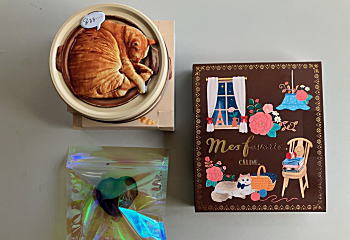 ^ω^) 左の丸い缶のがそうです。 開けると6匹のニャンコが寝ています(;^_^A こんなの食べられへんやん(笑)下の大きなハートのは長女の娘がくれたもの。 んで、右のがヨメからのプレゼント。包装では気付かなかったんですが、中身を見てみて、、、(;゚Д゚)?なんか見た覚えがあるなーと思ってたらFBから「三年前の今日」というお知らせが画像と共にやって来ました(;^ω^) やっぱ同じだったんですね(笑) |